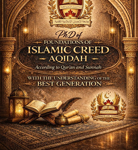 The Doctor of Philosophy (PhD) in Foundations of Islamic Creed (ʿAqīdah) at Al-Ihsan Canadian Islamic University is an advanced research degree dedicated to the systematic, evidential, and methodological study of Islamic theology as grounded in the Qur’an and the authentic Sunnah, understood in accordance with the comprehension (fahm) of the Best Generation (al-Salaf al-Ṣāliḥ): the noble Companions, their students (Tābiʿūn), and the followers of the Tābiʿūn.
